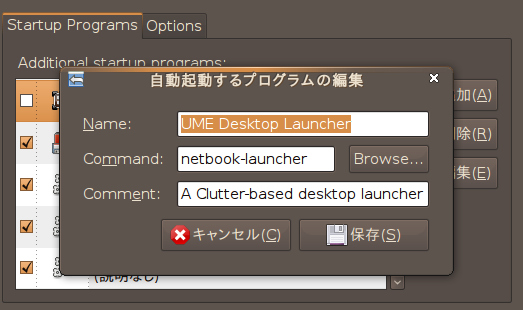環境によってはCompizとの干渉がうまくいかず, netbook-launcherが起動すると画面が乱れる, あるいは文字が表示されないといった現象に遭遇するかもしれません。この場合はnetbook-launcherを利用しないことで回避するしかないでしょう。