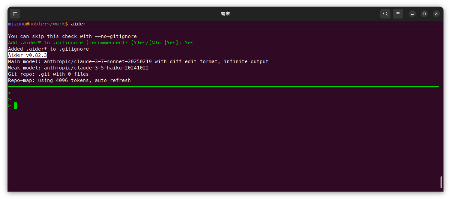 そのリポジトリではじめてAiderを起動した時は、以下のように