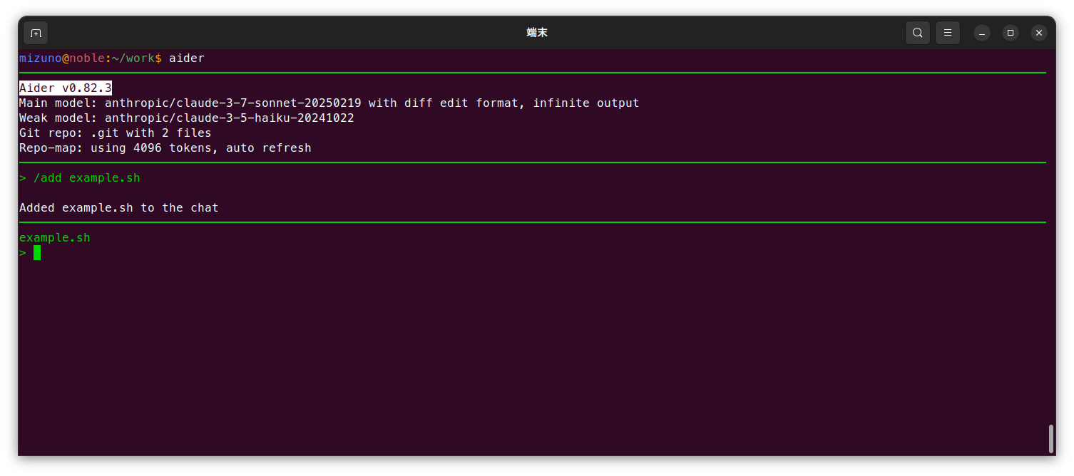 Aiderのチャットインターフェースでは、自然言語で様々なリクエストを入力できます。もちろん日本語にも対応しています。先ほど追加したexample.