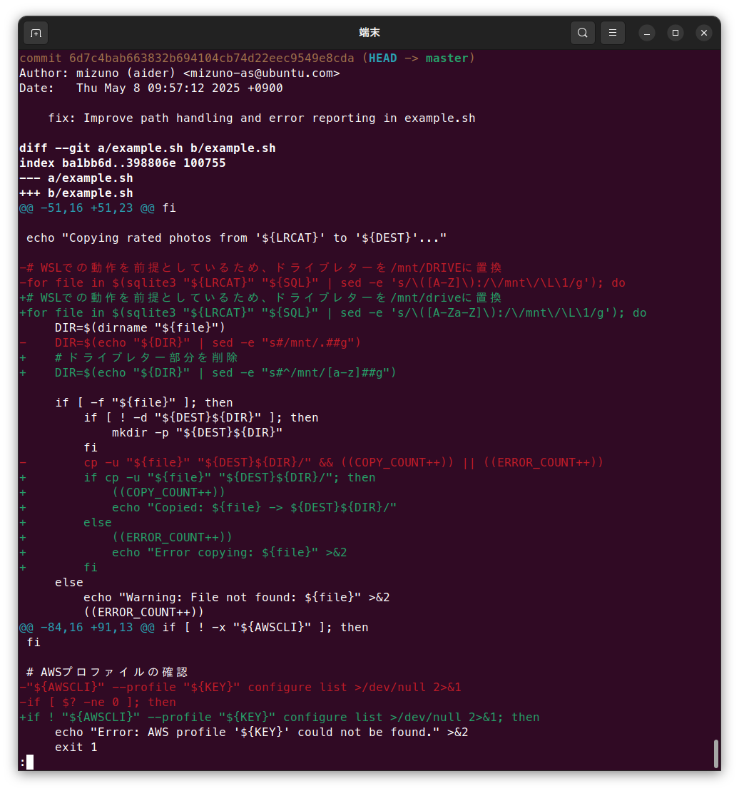 Aiderはデフォルトで、コードへの変更を自動的にコミットします。またコミットログも自動的に生成してくれます。前述のスクリプトの修正案も、以下のようにコミットされていました。