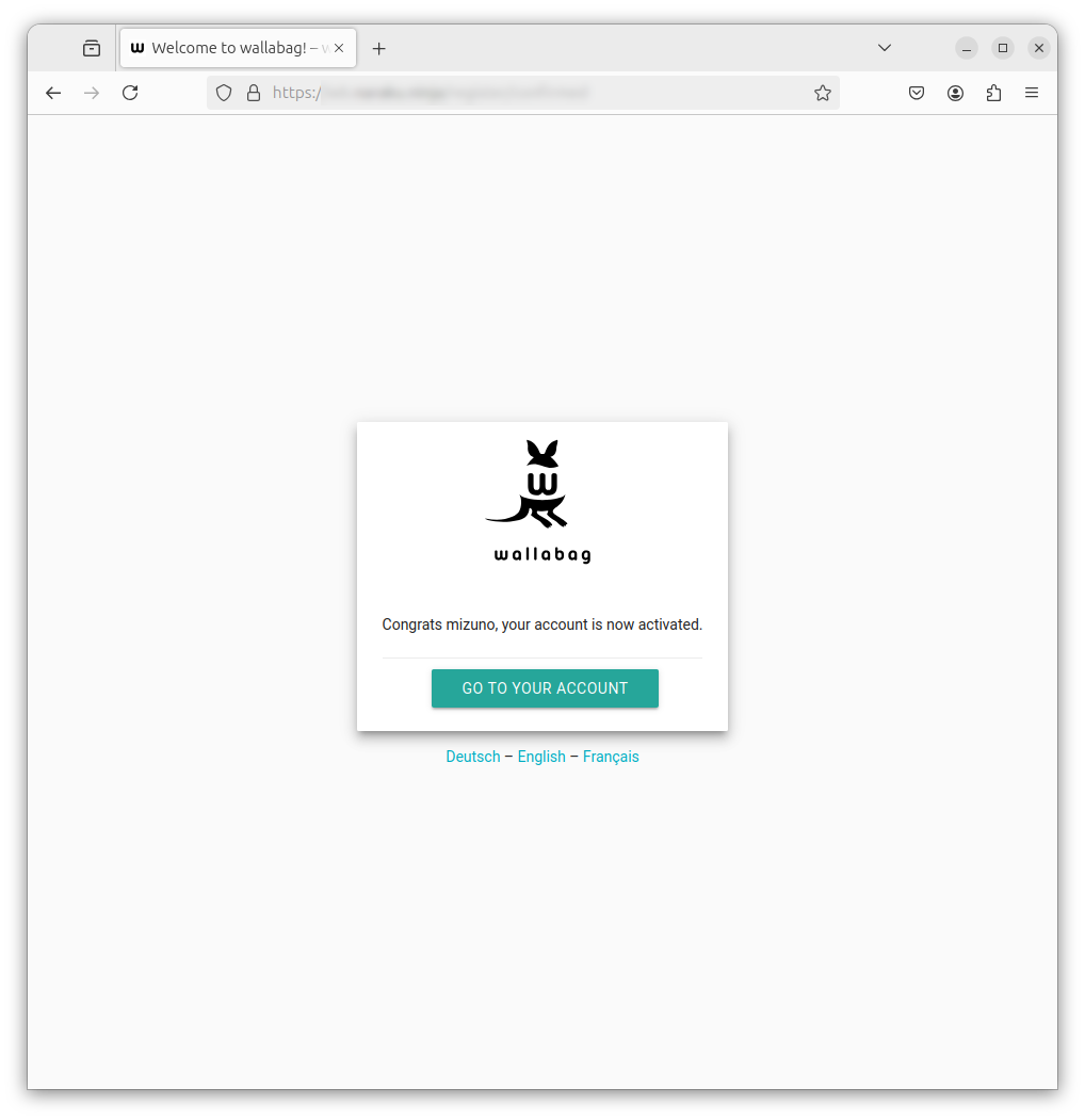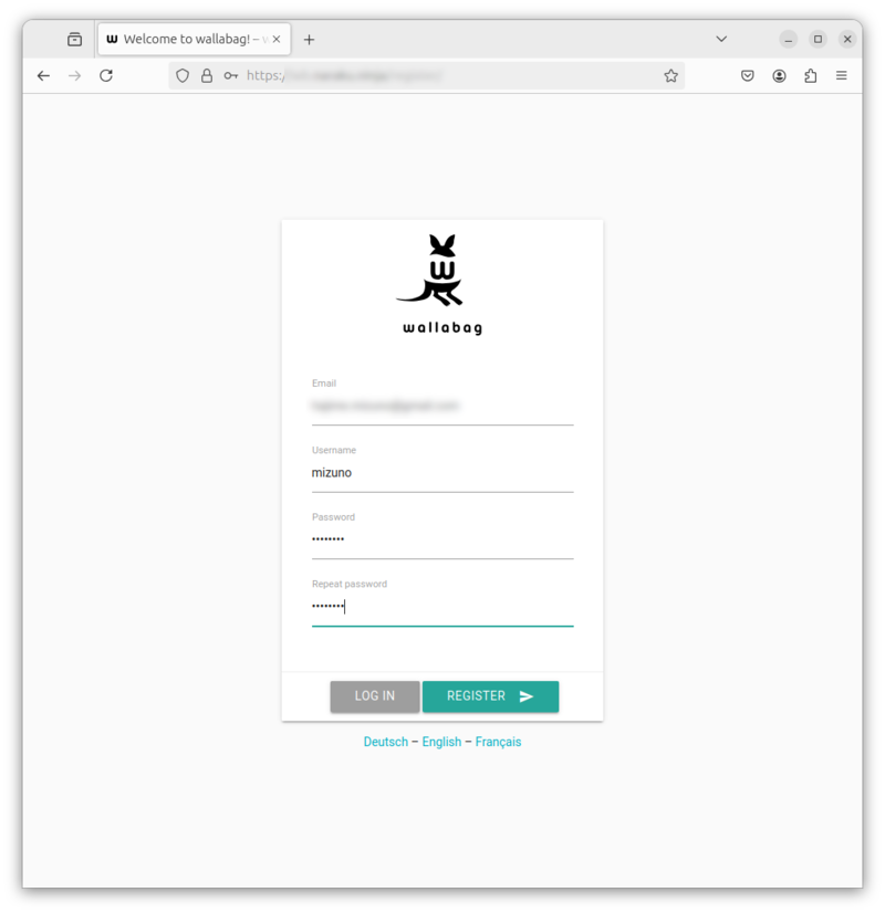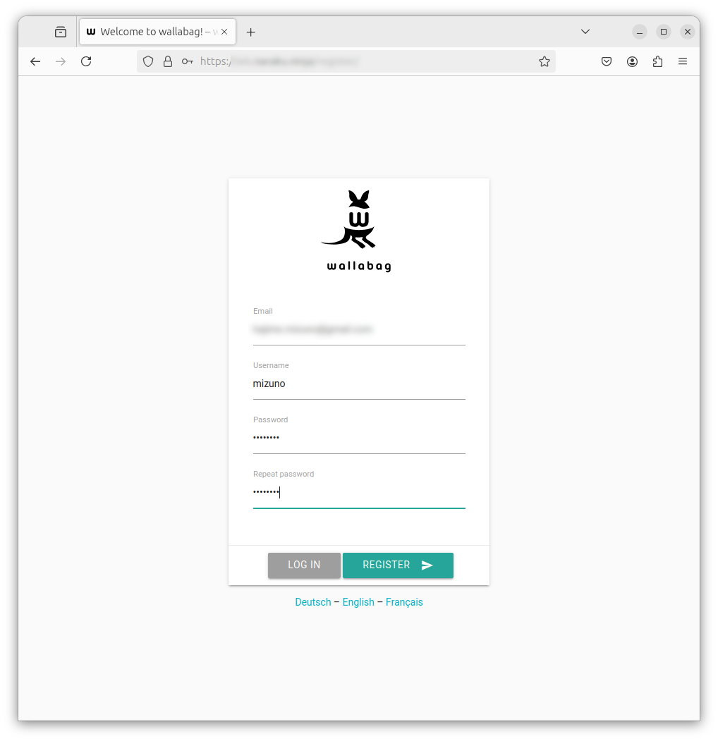 起動直後のWallabagにはアカウントが存在しません。まずはアカウントを作成しましょう。Wallabagのログイン画面で