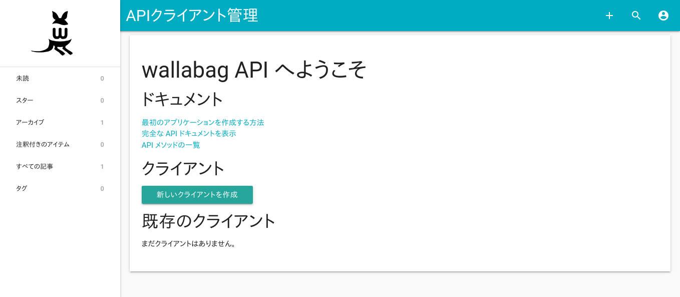 アプリからWallabagへアクセスするには、まず最初にクライアントを作成する必要があります。Web UIからWallabagにログインしたら、右上のアイコンをクリックして
