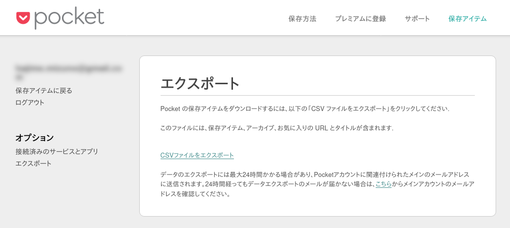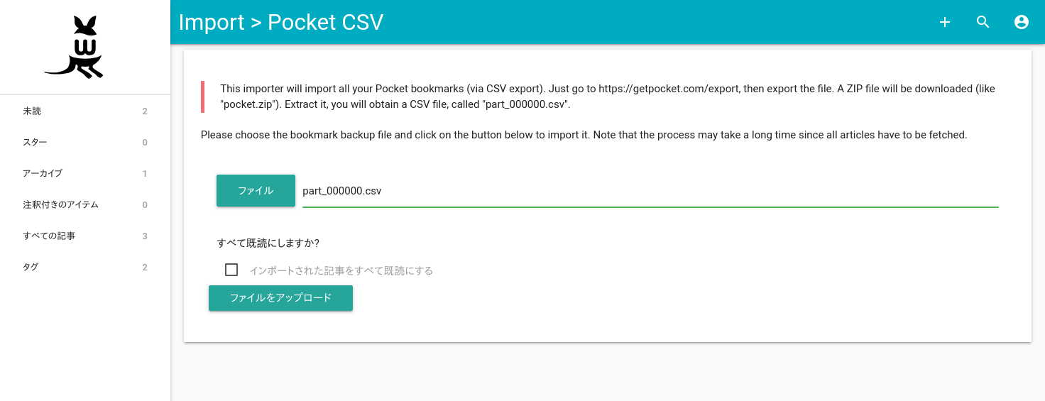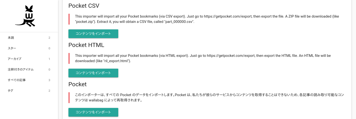 最後にPocketからのデータの移行方法を紹介します。最も簡単なのは、Pocket側でCSVをエクスポートし、それをWallabagへインポートすることです。