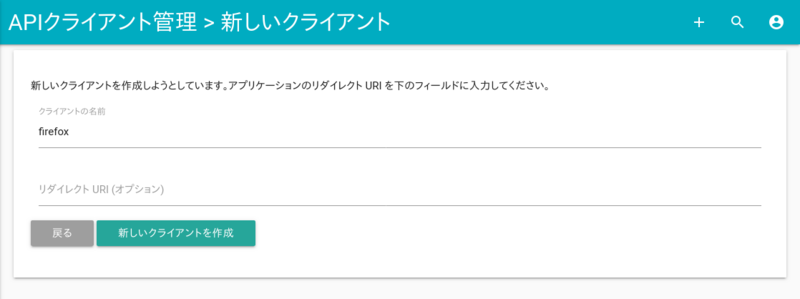 識別しやすいよう、クライアントに任意の名前をつけてください。リダイレクトURIは空欄のままで構いません。