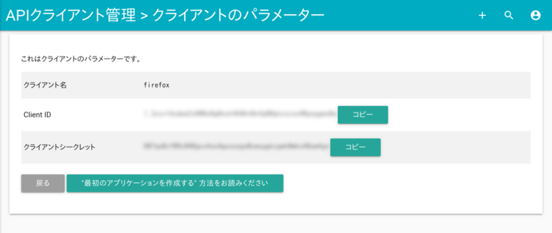 するとクライアントIDとクライアントシークレットが発行されます。これを控えておいてください。