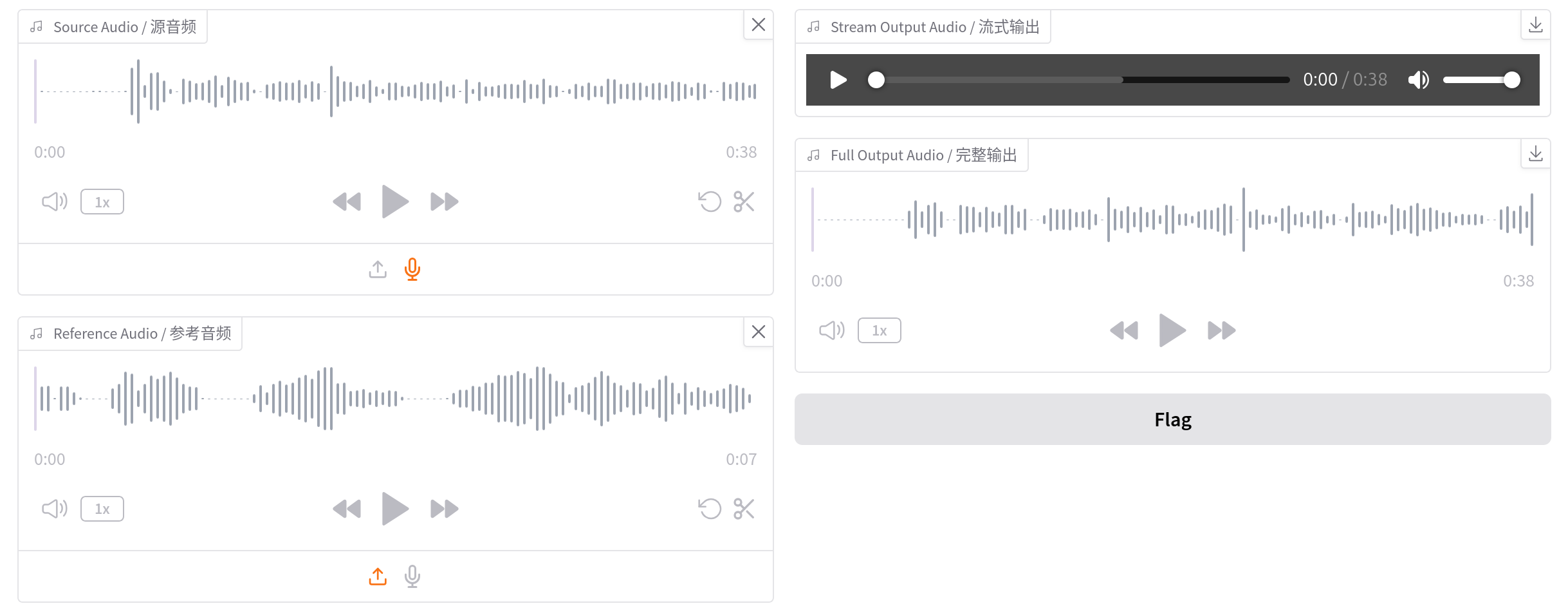 Streamのほうは30秒ぐらい変換した時点で再生ボタンが表示されます。その状態で再生すると、変換が進むごとに音声チャンクが末尾へと追加されるので、変換の完了を待つことなく確認が可能です。どちらも変換が完了したら、右上のボタンから変換後の音声ファイルをダウンロードできます。