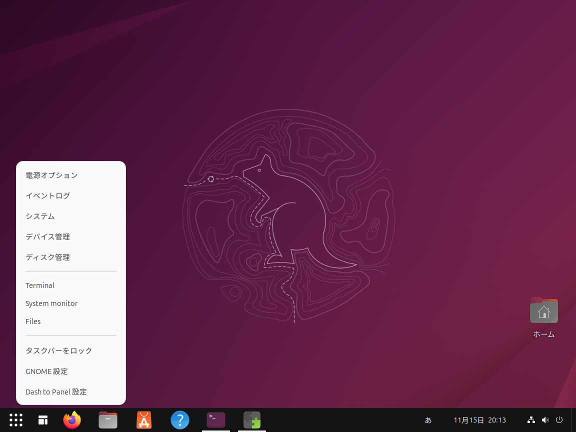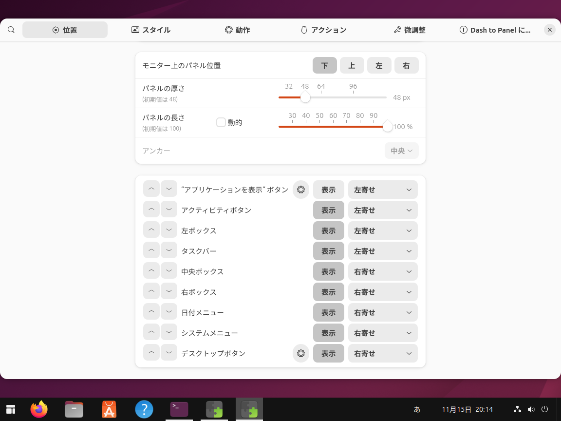 左端の「アプリを表示」を消すには、⁠アプリを表示」を右クリックしてメニューを表示し、⁠Dash to Panel設定」をクリックします。そして「"アプリケーションを表示"ボタン」「表示」をクリックすると非表示になります図17図18⁠。