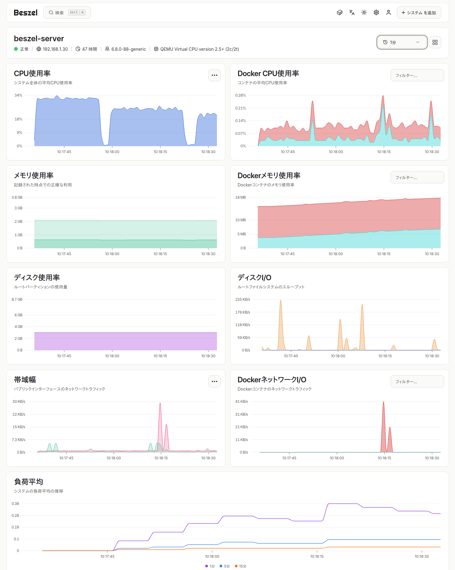 Beszelのダッシュボードから、監視対象のシステム名をクリックしてください。以下のようなグラフが表示されます。
