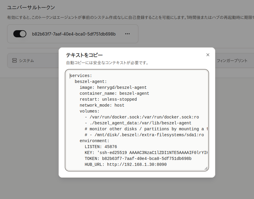 $ mkdir ~/beszel_agent && cd ~/beszel_agent $ cat > compose.yaml (ここに先ほどコピーしたYAMLをペーストしてから、Ctrl+Dを押す)