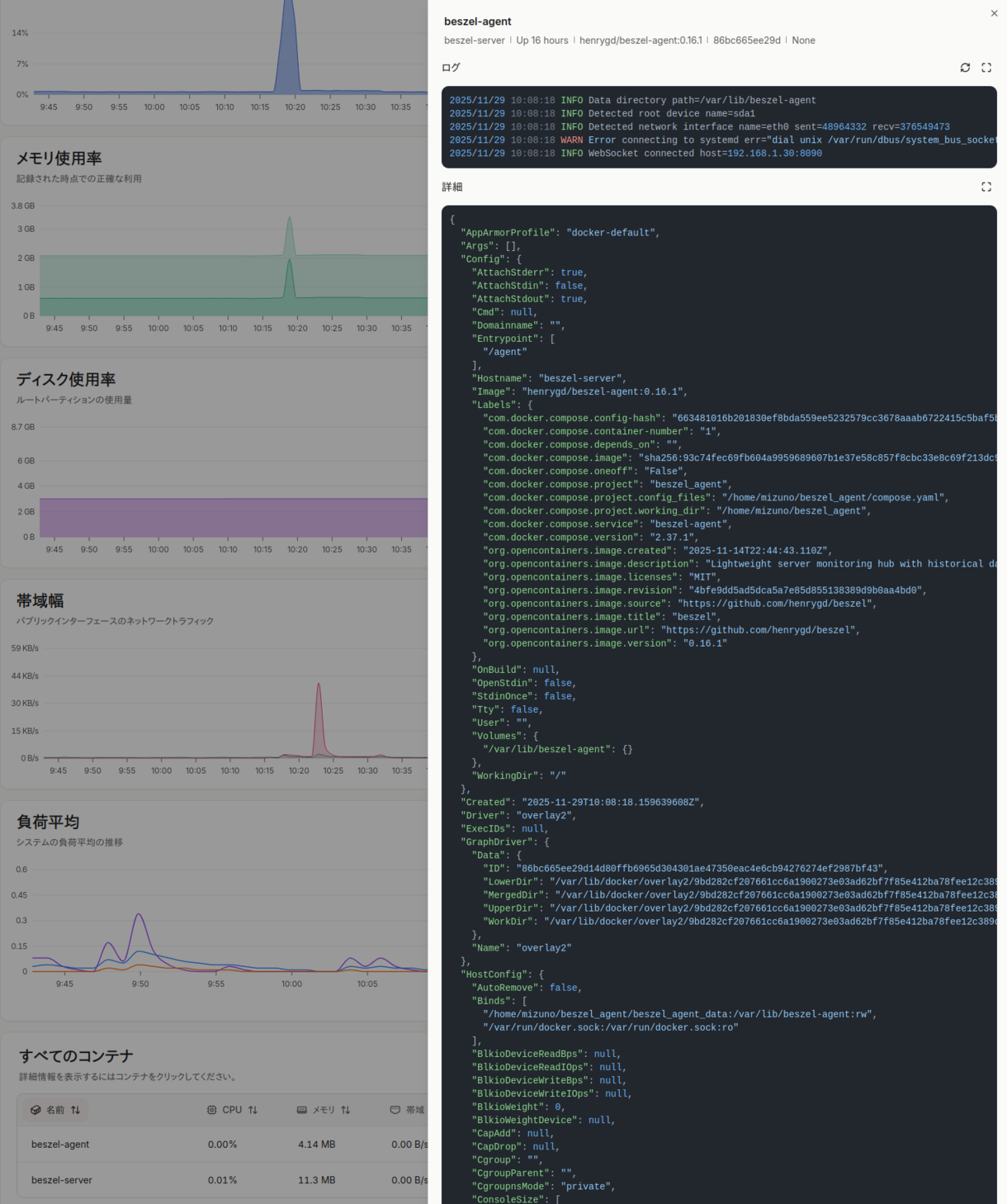 Dockerコンテナの監視に対応しているのも、今風です。今回構築したサーバーでは、ハブであるbeszel-serverコンテナと、自分自身を監視するbeszel-agentコンテナのふたつが起動しているため、以下のように表示されます。