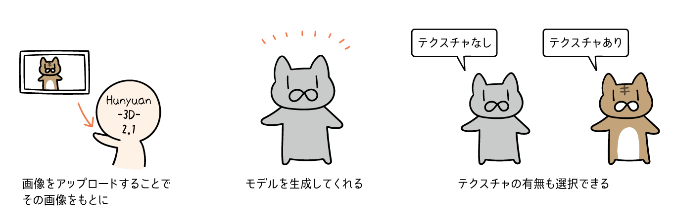 Hunyuan3Dは、Tencentが開発した3D生成AIモデルです。バージョンがいろいろと存在しており、キャラクターや小物などの生成に特化したシリーズや、3Dワールドの生成に特化したシリーズなどがあります。