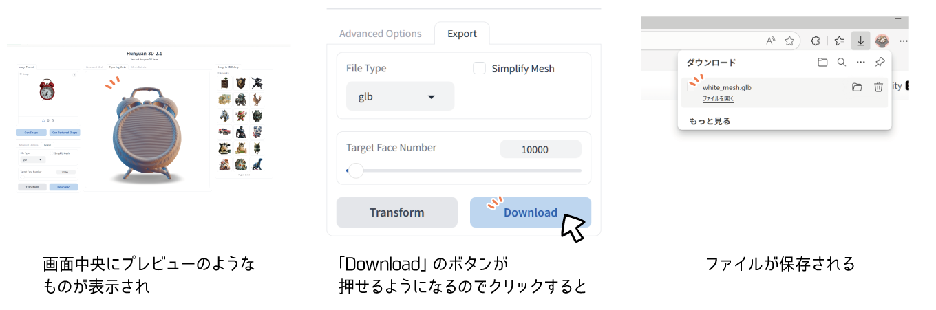 すると、「 Export」のタブで設定した最終的な3Dモデルが画面中央のプレビューに表示されるので、確認しておきましょう。「 Download」のボタンが押せるようになるので、そのボタンを押すとどこに保存するか聞かれます。任意の場所を選んで保存しましょう。