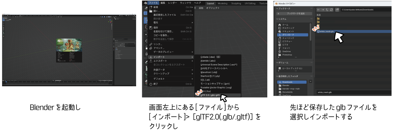 Blenderを起動したら、画面左上にある[ファイル]から[インポート]> [ glTF2.0(.glb/.gltf)]をクリックし、表示されたウィンドウから先ほど保存したglbファイルを選択してインポートします。