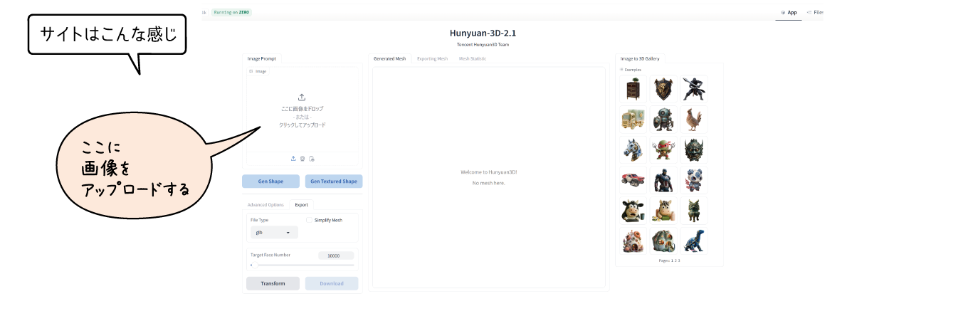 ページが表示されたら、Hunyuan3D 2.1を使える状態になっています。このページで、生成してもらいたい3Dモデルの元となる画像を設定する必要があります。