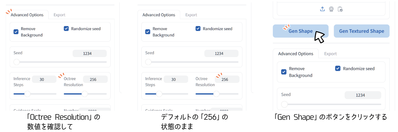 画像がアップロードできたら、頂点の数を調整することも可能です。画面左側にある「Advanced Options」の項目を開き「Octree Resolution」の数値を変えることで、モデルの細かさを変更できます。数値が大きいほど細部まで再現されます。まずは試しにデフォルトの状態にある「256」でモデルを生成してみます。