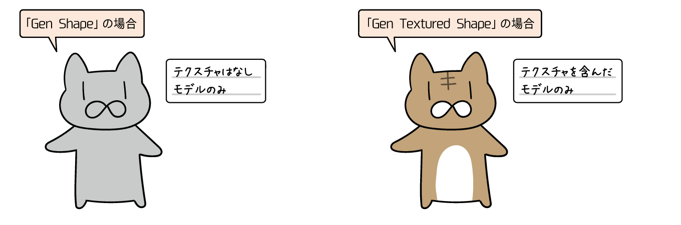 モデルを生成するボタンは2つありますが、「 Gen Shape」ではテクスチャなどは適用していないモデルが、「 Gen Textured Shape」ではテクスチャなども込みのモデルが生成されます。