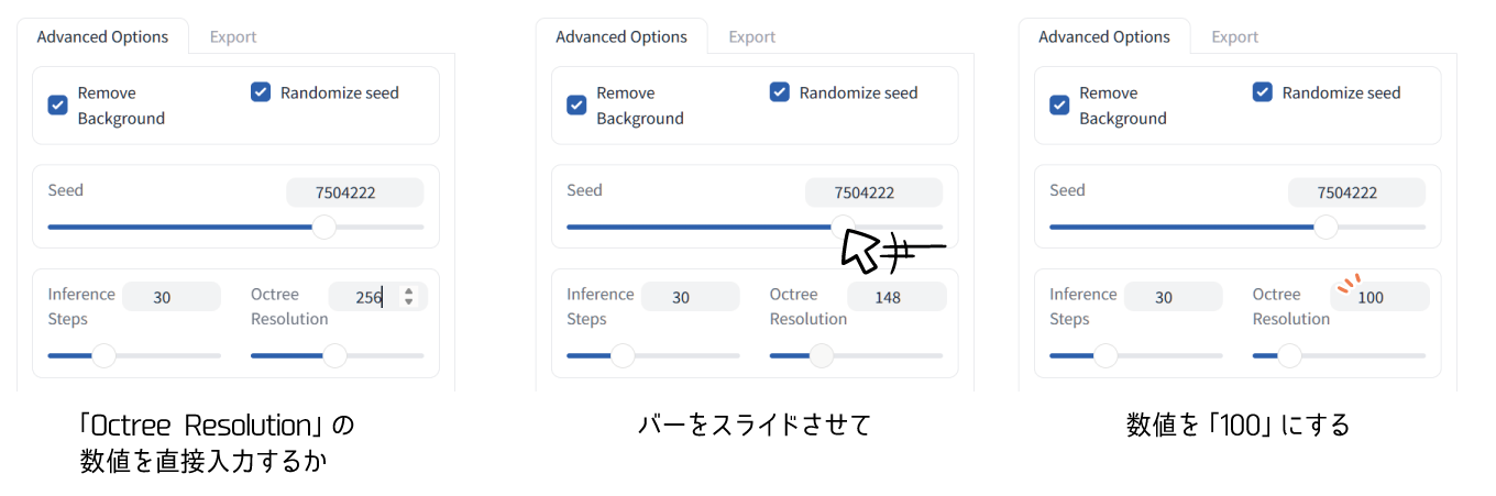 次に、「 Octree Resolution」の数値を下げてみます。この欄に数値を直接入力するか、下にあるバーをスライドすることで数値を変更できます。バーは左にスライドすると数値が小さくなり、右にスライドすると数値が大きくなります。今回は数値を「100」にしてみます。