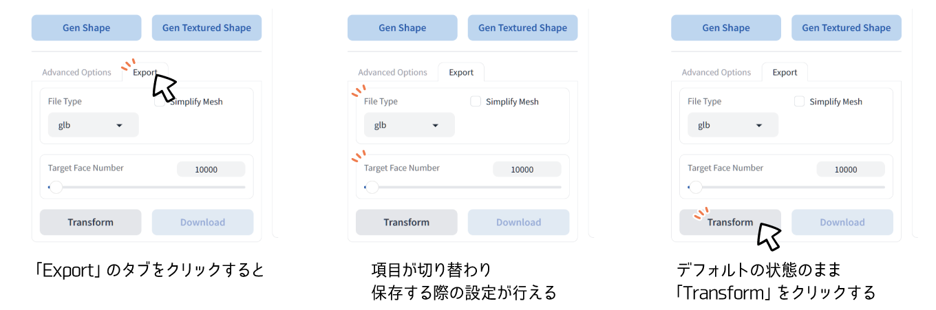 生成したモデルを保存してみます。画面左側「Export」のタブをクリックします。「 File Type」は、Blender上でインポートすることなどを考えるとデフォルトの状態の「glb」のままでいいでしょう。「 Target Face Number」も特に変更することなく、「 Transform」のボタンを押します。