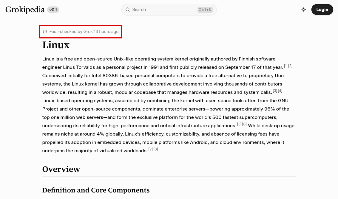 用語の説明内容の正しさを検証するために、同社のAI、Grokによる事実確認が行われており、ページではいつ事実確認を行ったかの情報が記されているのが特徴だ