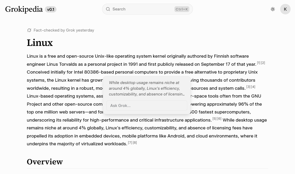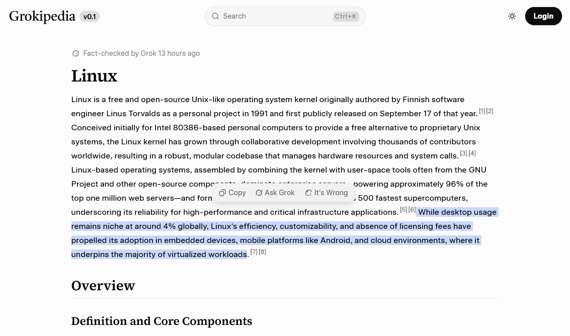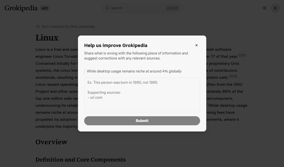 Grokpediaは真実を伝えることを目的としており、Wikipediaよりも正確で、偏りのない情報を提供するために作成したとされている。