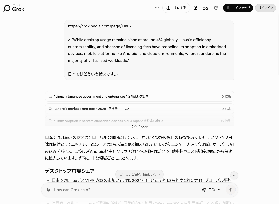 質問を送信するとGrokのサイトに遷移する。自動的にGrokpediaのURLと選択した引用文、質問内容がプロンプトとして与えられ、Grokはその情報をもとに回答を生成する。