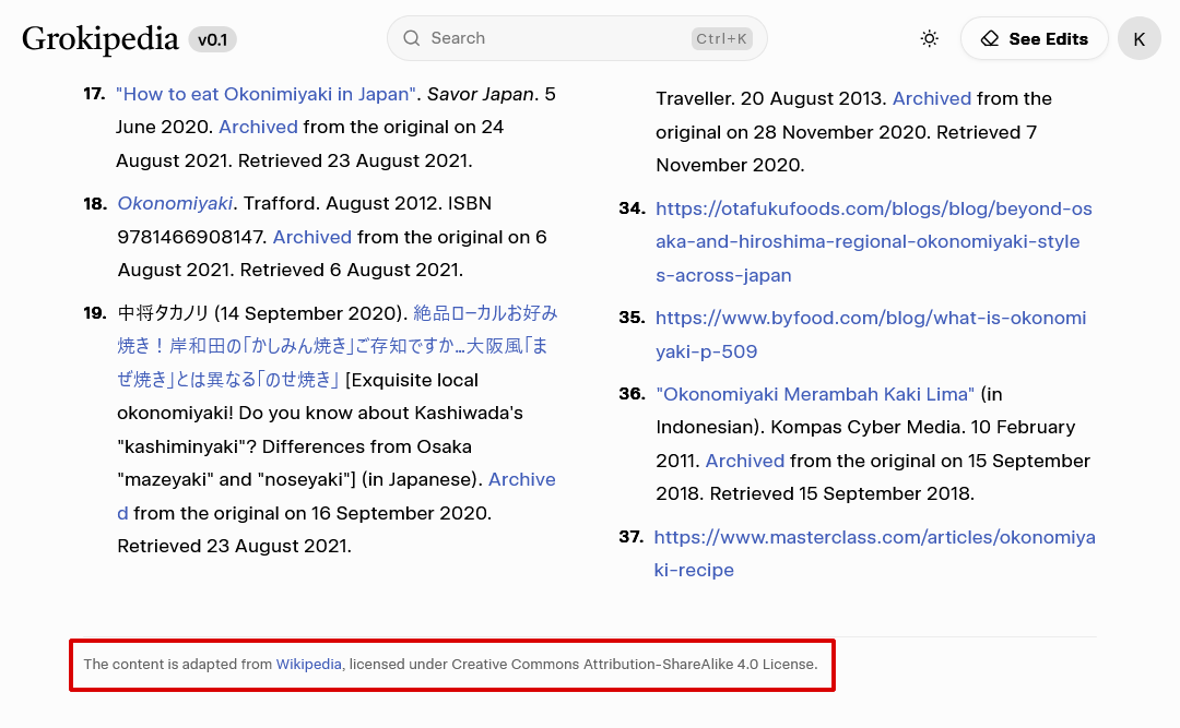 なお、Grokpediaには、Wikipediaの内容を利用したページもあり、そのページでは、ページ末尾にWikipediaの内容を利用した旨が記載されている