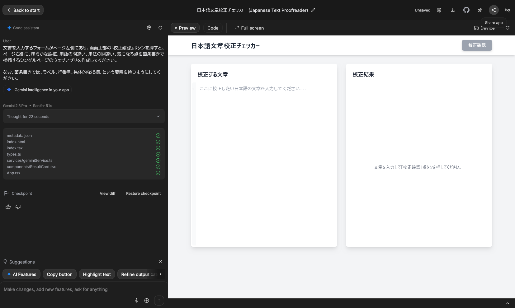 while your app is being built, Gemini generates context-aware suggestions for new features, API integrations, and more to supercharge your project