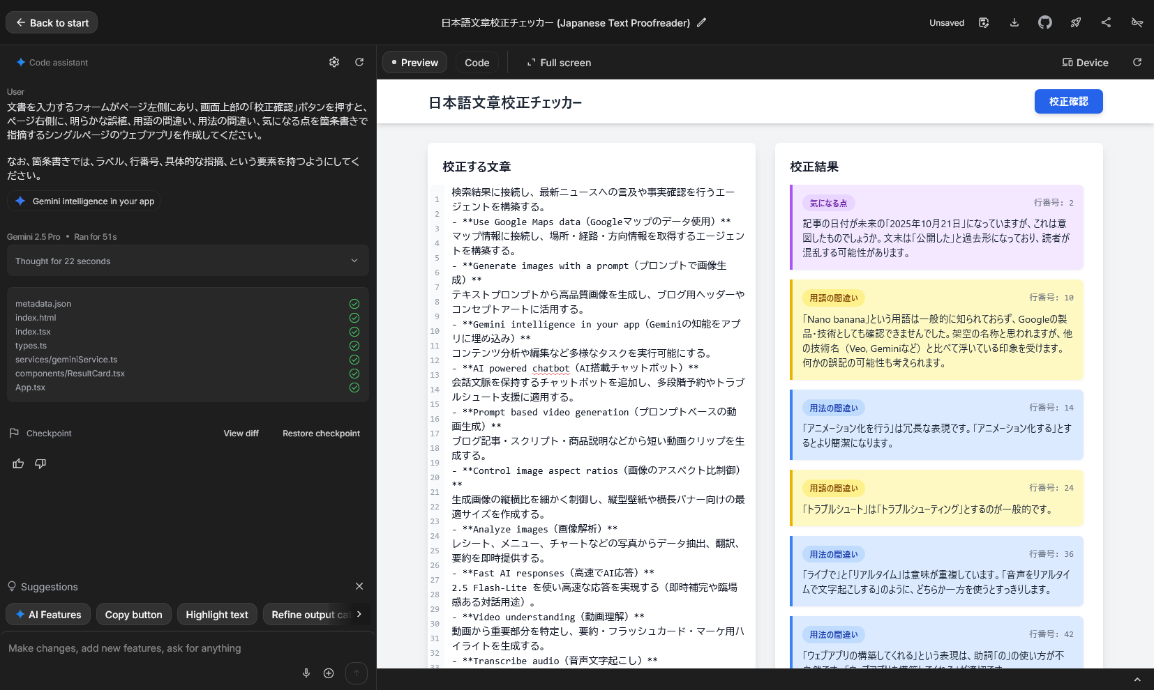 またBuild中は、Geminiが新しい機能やAPI統合などについてコンテキストに応じた提案を生成し、プロジェクトを強化できるようになったとのこと。