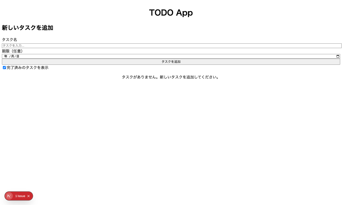 Claude Codeに同じようにエラーテキストの内容を貼り付けての指示を何回か繰り返すことで、無事起動しTODOアプリを動かすことができました。