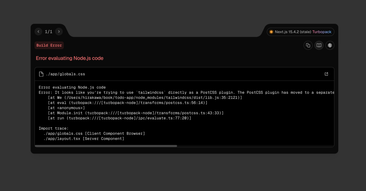 その後も筆者の環境では、Reactのサーバーとクライアントの描画が異なることで起きるハイドレーションエラーや、TurbopackとTailwind CSSの互換性のエラーが出ました。