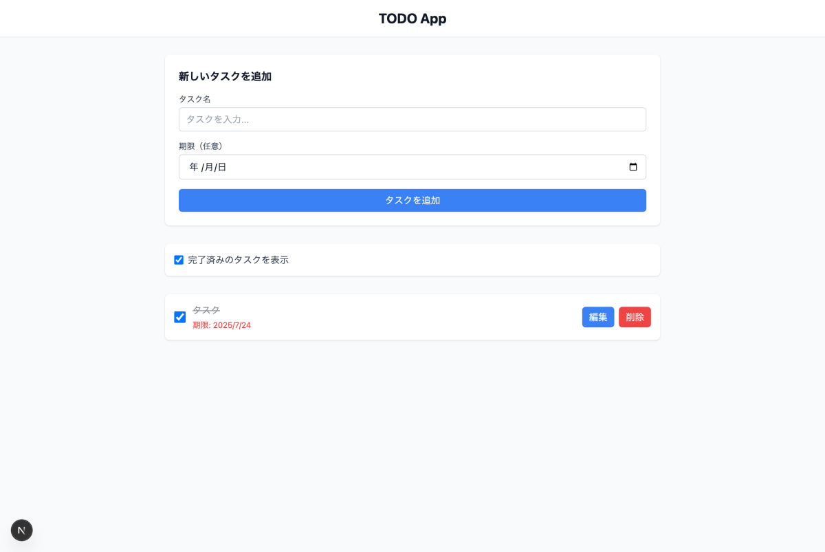 今回作ったTODOアプリケーションをVercelにデプロイしたバージョンを以下のURLにアップしていますので参考にしてください。