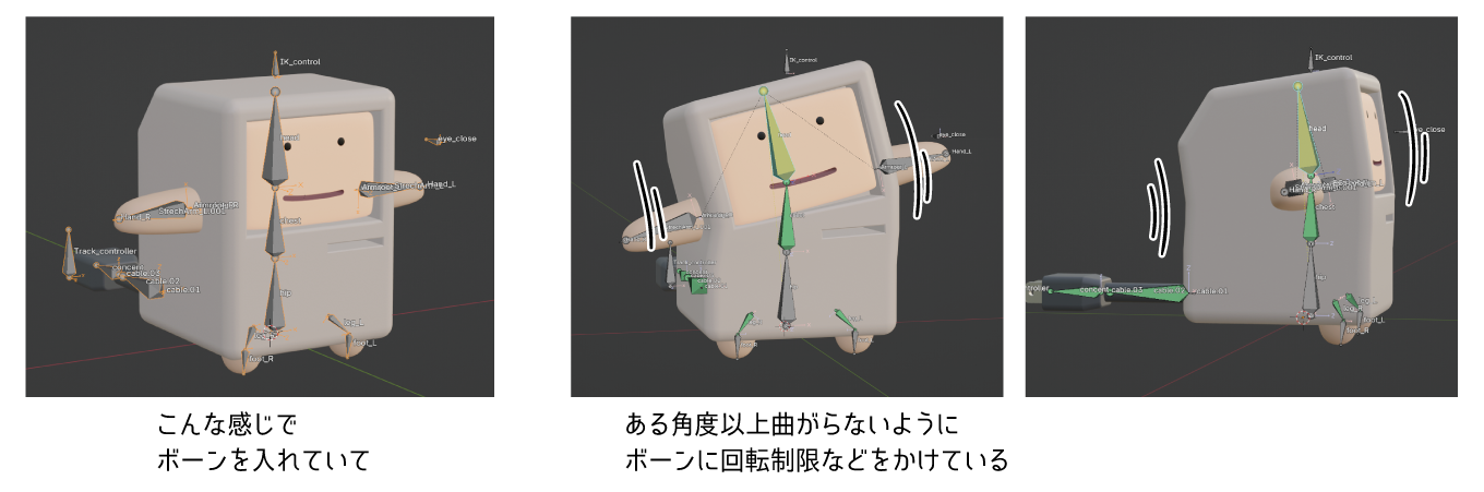 わたしはこのモデルに対してボーンを設定したり、その後の動画を作成するところまでを担当しました。ボーンを入れるときは、個別のボーンに回転制限などのボーンコンストレイントを設定することで、誰が動かしてもモデルが変にねじれてしまうことなどを防ぎました。