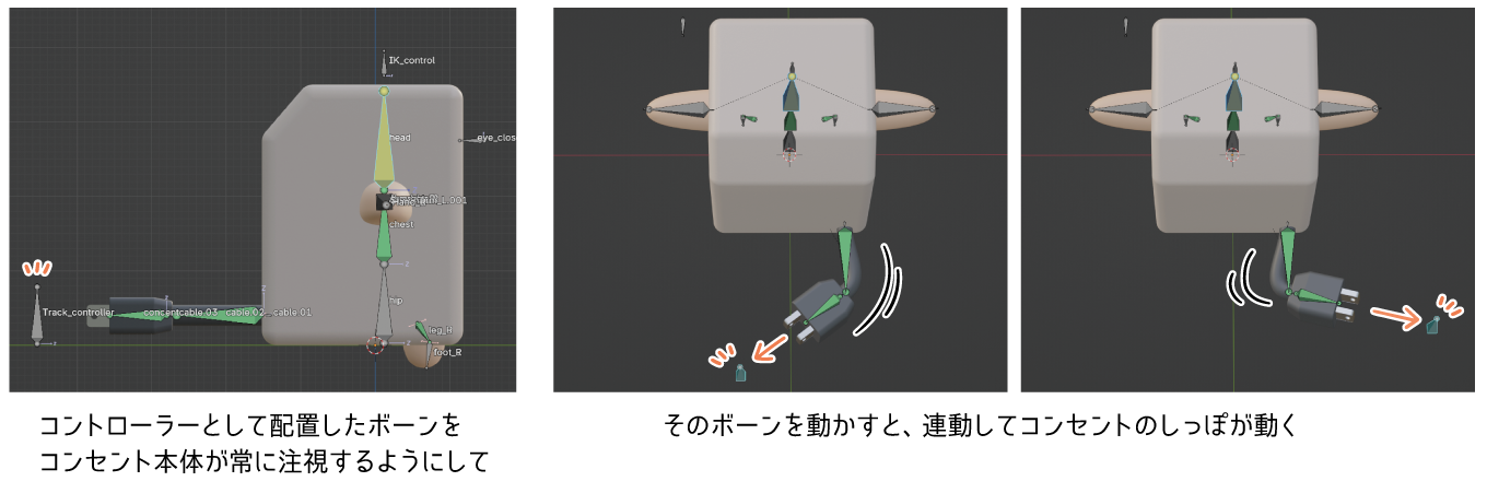 コンセントのしっぽ部分には、コンセントの先端より少し先にしっぽをコントロールするボーンを配置しています。そのボーンを常にコンセントが注視するように設定することで、コンセントの動きを制御しやすくしています。