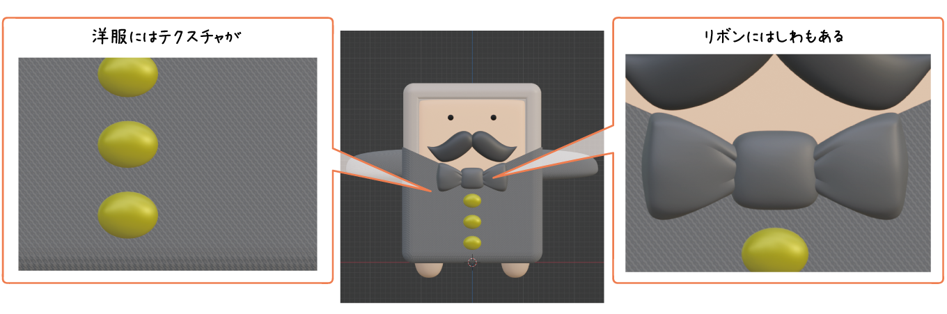 次はサーバです。こちらは、パソコンくんとほぼ同じ構成になっています。サーバは洋服を着ているので、きちんと洋服にはテクスチャが施されています。また胸のリボンにも、しわがしっかりと作成されています。
