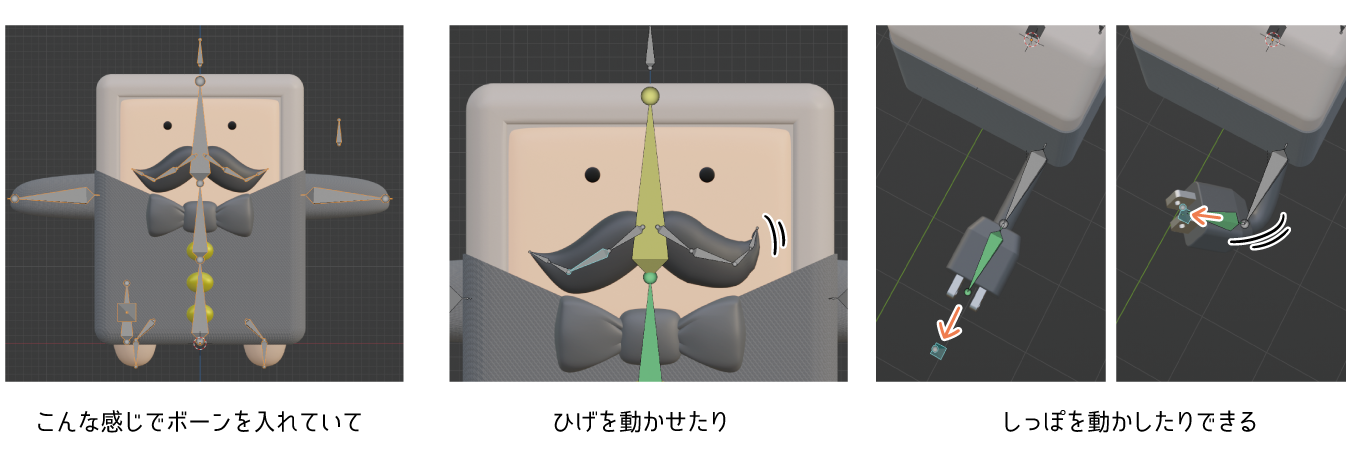 サーバでは、ひげも個別に動かせるようにそれぞれにボーンを設定しています。コンセントのしっぽも同様に、ボーンコンストレイントを設定して動きを制御しやすくしています。