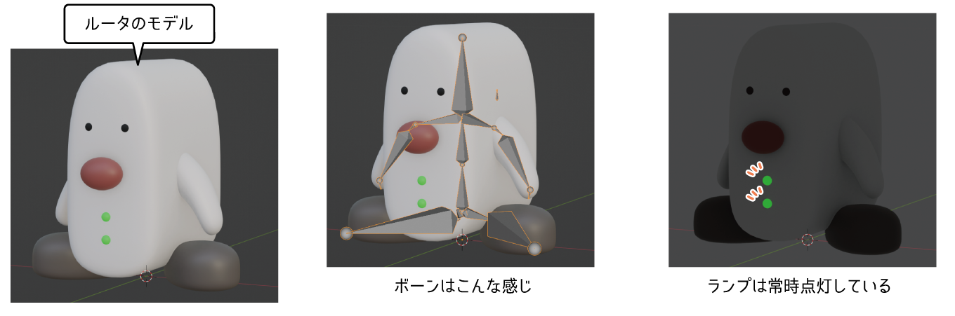 この作成済みのモデルをアニメーションさせるために、いくつかの設定をおこないました。ここでは各モデルを紹介しながら、わたしがどのような設定をおこなったかを見ていきます。