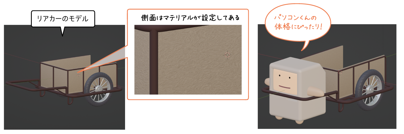 書籍には出てきませんが、サーバをリアカーに乗せ、パソコンくんが引っ張る、という動きを作成するために制作されたリアカーです。サイズはパソコンくんにあわせられています。