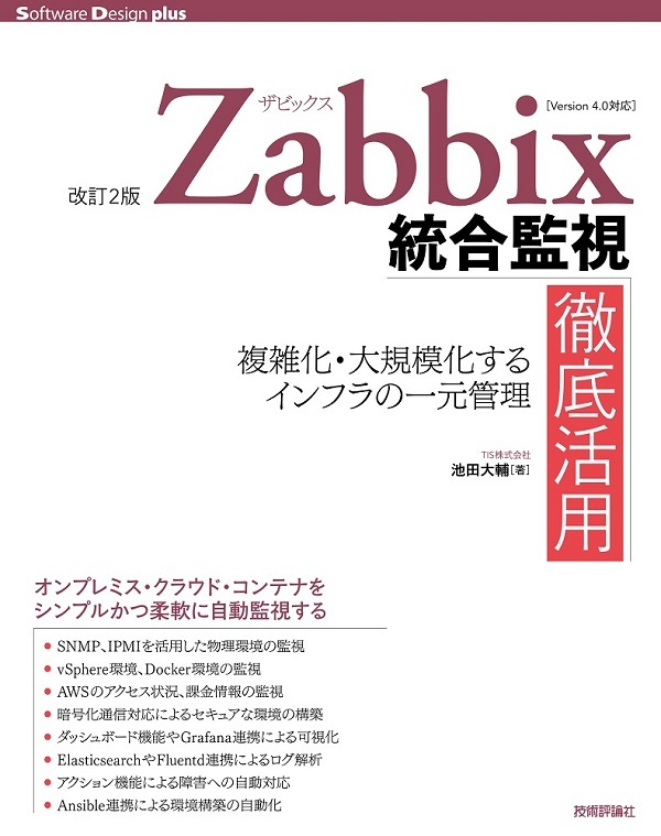 Zabbixの活用方法に焦点をあてた同書名の書籍の改訂版です。改訂にあたり、Zabbix自体の機能追加への追随、特にスクリーンやダッシュボードの活用といった監視結果データのビジュアル化や、収集したデータの分析、インフラ面で進んでいるDockerなどのコンテナ技術への対応など、利用実態に則した内容のアップデートを行っています。