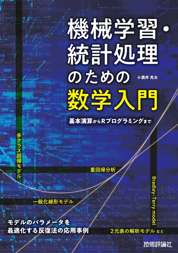 数学の素養があるだけではデータサイエンスのプロとは言えません。なぜなら、実際の数理モデル開発やデータ分析では、組み合わせ方やプログラミングの知識が必要になるためです。また、データ分析では、数値微分・数値積分の知識がプログラミングで計算する際には非常に役立ちます。そこで本書では、数値計算やパラメータ計算法などを説明したあとに、応用編として現場で利用されるデータ分析方法を取り上げます。具体的には「対数尤度(ゆうど)の最大化法と重回帰」「一般化線形モデル」「多クラス回帰モデル」「Bradley-Terry model」「2元表の解析モデル」「生存時間解析(ワイブル分布)」で、Rによる数値計算のプログラムも併記しています。本書を活用していただくと、例えば機械学習モデルのパラメータを導く際に必要な二階偏微分を要素とする行列(ヘッセ行列など)の計算が非常にラクになり、データサイエンスにおけるプログラミングで数値微分・数値積分や数値計算そのものの重要さを再確認できるでしょう。