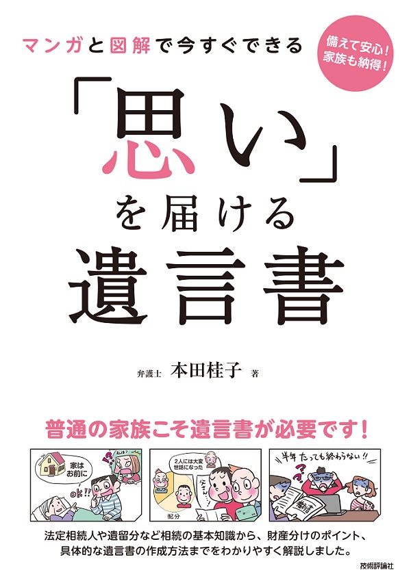 本書は、「普通」の家族が相続トラブルを避け、「思い」を次代に伝えるための遺言書づくりのポイントを、さまざまなケースについて豊富なマンガとイラストで解説したものです。遺産相続の現状や、将来予想される相続トラブルを避けるために、どんな遺言書を作ればいいのかをわかりやすく説明しています。自筆証書遺言の文例や、公正証書遺言作成の手順もあるので、実際に遺言書を作る際に役立ちます。文例も多数掲載。本文紙面と、ダウンロードで、相続準備や遺言書作成に活用できる下書き用シートも提供しています。ぜひ大切な人と一緒に、本書を見ながら初めての遺言書づくりに挑戦してください。