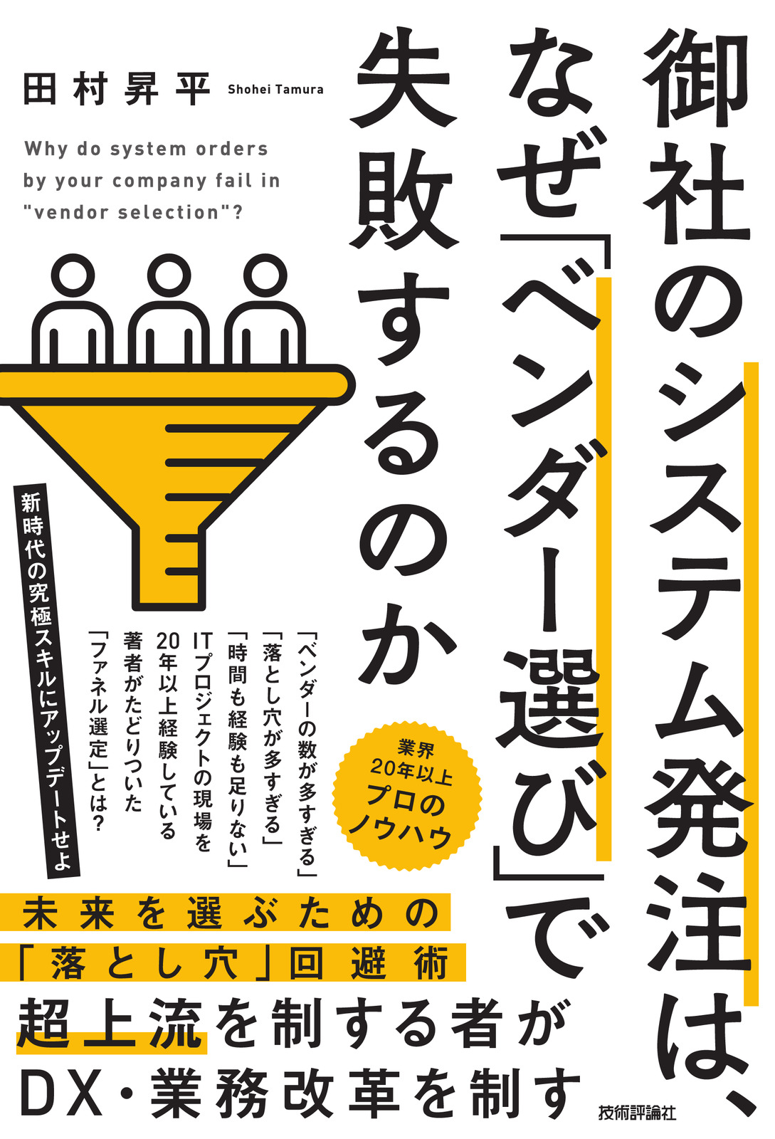 成長戦略という錦の御旗のもと、システム化やDX推進の指示が増大しています。しかし、あわててITプロジェクトを始動したあなたに、次の法則が立ちはだかります。「プロジェクトの半分以上が失敗する」。これは一体なぜでしょうか? 著者によれば、プロジェクトは「上流がにごれば、下流はもっとにごる」もの。ITベンダーが決まるまでの長い道のり「超上流」に問題のほとんどが集約されています。本書は、前著では触れることのできなかったこの問題に焦点を当て、ユーザー企業が安易な選択をしてしまうワナから説き起こします。そして、ベンダー選定の究極ノウハウ「ファネル選定」を提唱します。前著をお読みでない方も、本書を手引きにまずはこの最優先課題に取り組んでください。