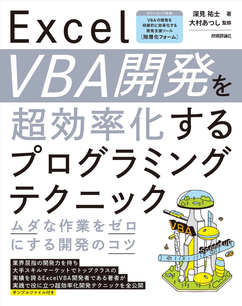 Excel マクロ(VBA)のプログラミングがある程度できるようになると次に知りたいと思うのが「開発(プログラミング作業)の効率化」。本書は「開発の効率化を極限まで高める」ことを目的として、開発を効率化するためのテクニックを集めた書籍です。