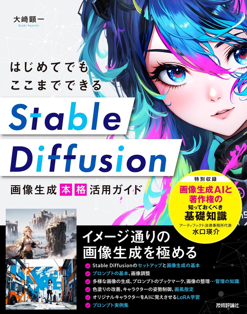 本書では、Stable Diffusionに初めて触るビギナーにもわかりやすくその使い方を一から解説し、さらに画像を作り込むうえで欠かせない拡張機能、オリジナルキャラクターをAIに覚えさせるLoRAの作成方法といったStable Diffusionを使いこなすうえで知っておきたい知識までを網羅して解説します。