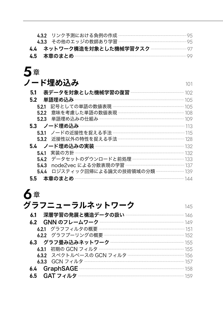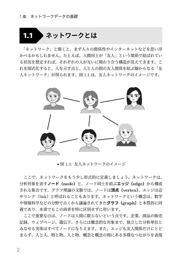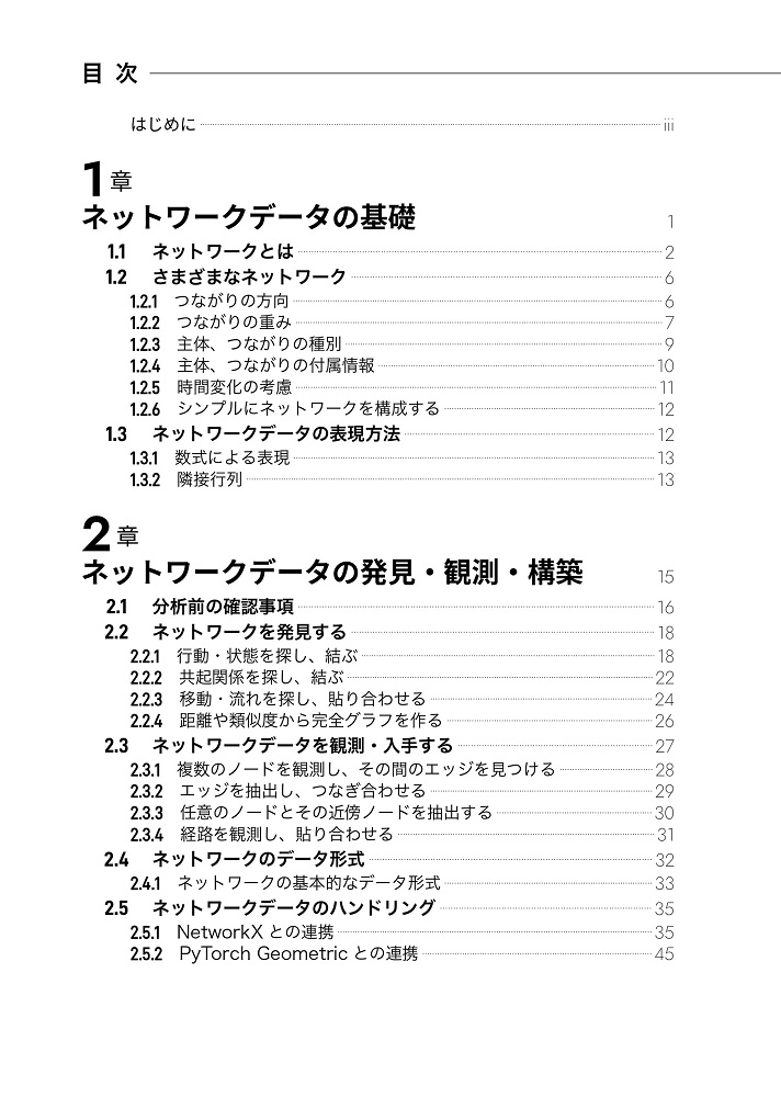 近年では、計算機リソースの向上や新しいアルゴリズムの登場により、ネットワークデータの実用化が急速に進んでいます。本書では、各手法について平易な言葉で解説することを目指すだけでなく、Pythonを用いたコード例を通じて、データの取り扱いから特徴抽出、さらにNode EmbeddingやGNNといった機械学習手法への応用までを実践的に紹介します。