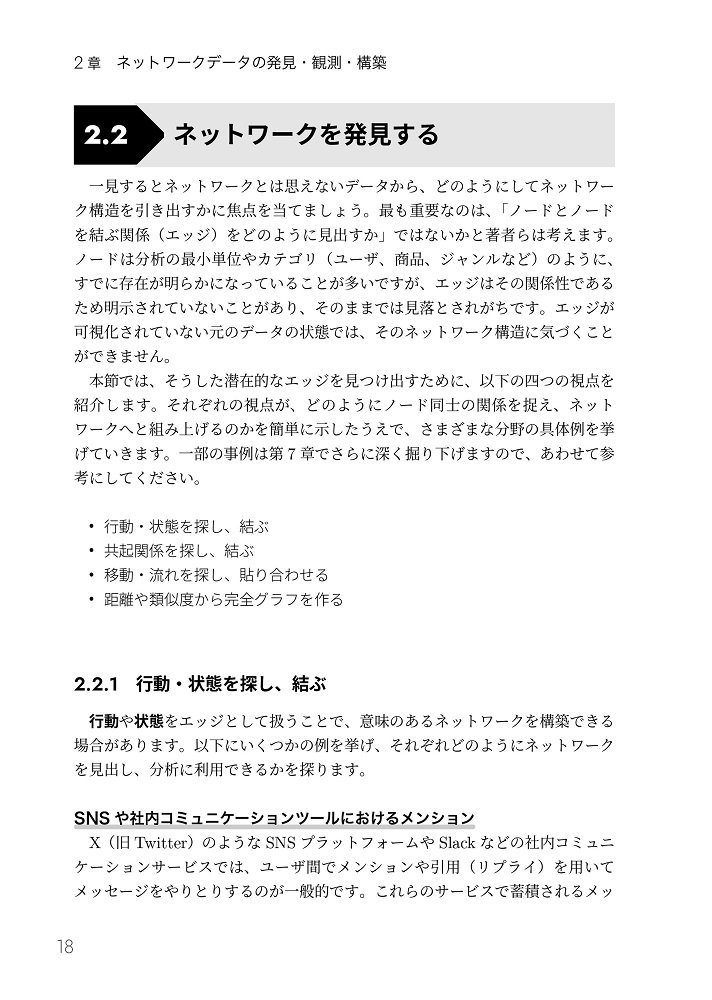 また、単なる技術の羅列ではなく、身近なデータからネットワーク構造をどのように見出し、意味付けし、課題解決に結びつけるかという思考プロセスや応用事例にも重点を置いています。具体例としては、SNSのフォロー関係やWebページのリンクといった典型的なネットワークデータはもちろん、ECサイトの購買履歴やビジネス文書、さらにはレシートといった、通常「表形式」で扱われるデータに隠れた「つながり」を抽出・活用する手法を丁寧に解説します。