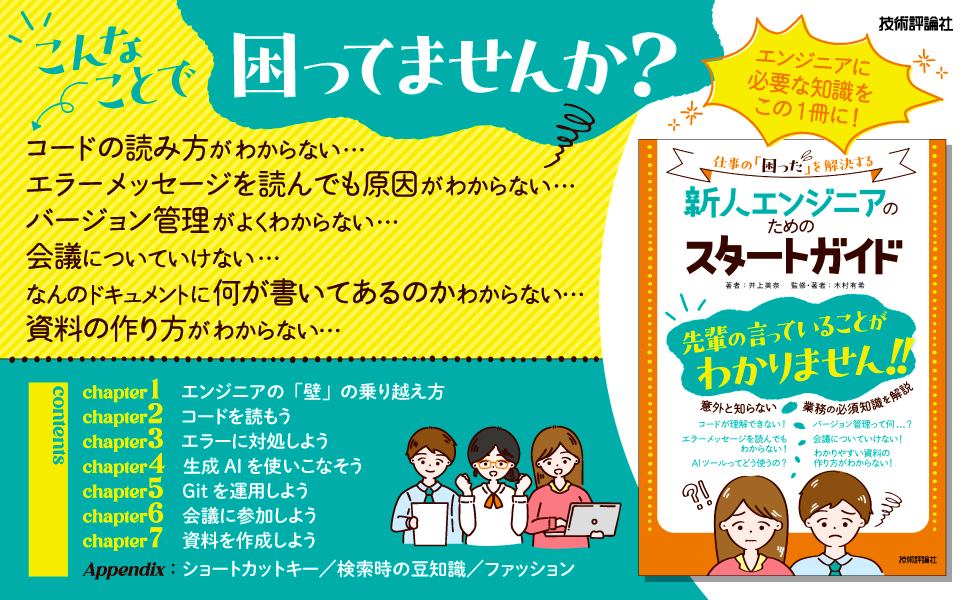 コードの書き方は学んだけれど、他人が書いたコードの読み方はわからない。エラーメッセージの読み方がわからない。AIツールやバージョン管理ツールの使い方がよくわからない。会議に参加してみたら、周りが何を言っているのかさっぱりわからない。わかりやすい資料の作り方がわからない⋯。そんな若手エンジニアに向けて、コードの読み方や会議内容の理解、GitやAIの使い方など、実用的な情報までをイラストを交えながらやさしく解説します。