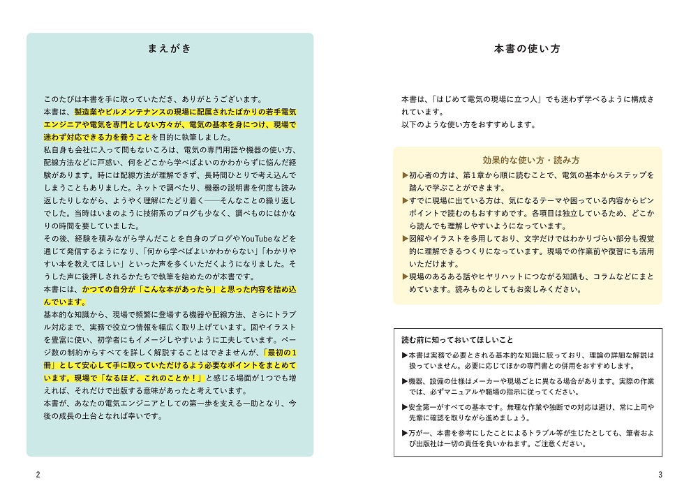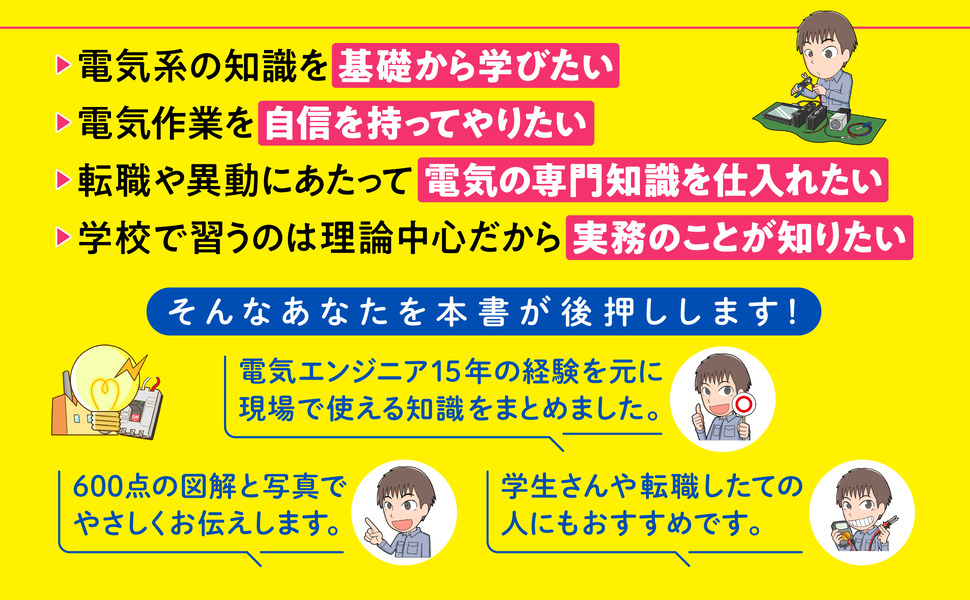 工場、ビル、施設などの現場で電気関係の仕事を行う方に向けて書かれた本です。仕事を始めて1~3年くらいの電気エンジニアの方、電気工学・電子工学を学ぶ学生の方、転職などで新たに電気関係の仕事をすることになった方は、以下に思い当たることがないでしょうか?