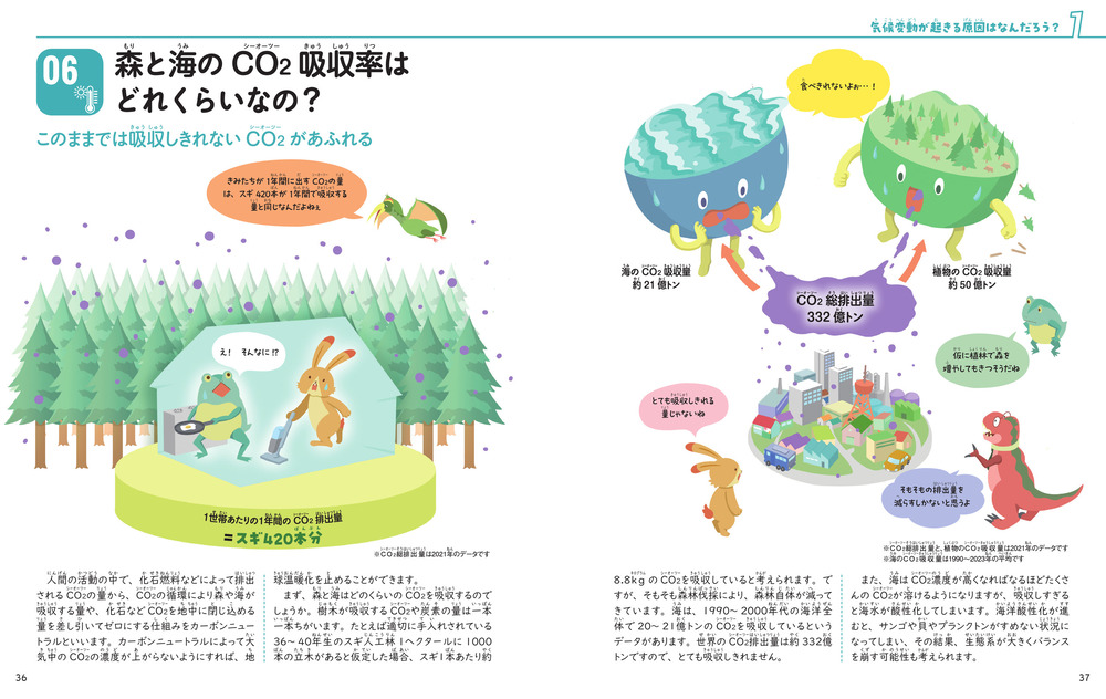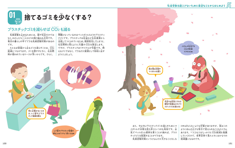 地球科学の視点も交え、さらに江戸時代のエコ生活から現代に活かせるヒントや身近なところからはじめる気候変動対策など、ウサギさん、カエルさん、ティラノサウルスさん、ケツァルコアトルスさんが身近な例を挙げながらやさしく解説してくれます。