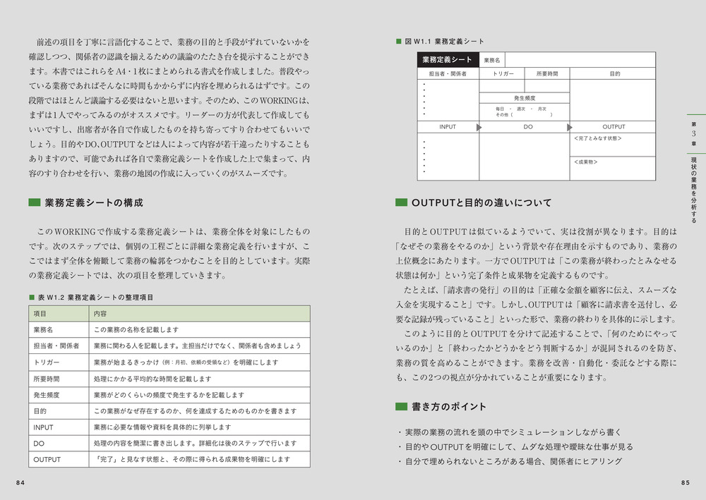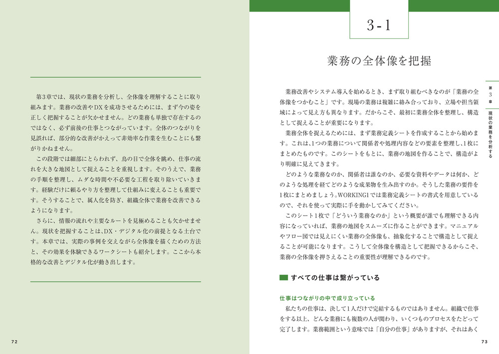 特徴の2つ目が、「現場主導で進める多角的な現状分析と可視化のための実践的なWORKINGを収録している」点です。本書で取り上げている数々のワークシートを通して、業務部門とシステム部門が共通認識を持ちながら、部分最適に陥ることなく全体最適な業務プロセスを構築する方法を詳述しています。