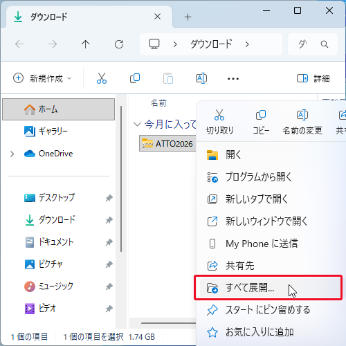 ダウンロードしたファイルは[ATTO2026]という名前です。通常は[ダウンロード]フォルダ内に保存されます。